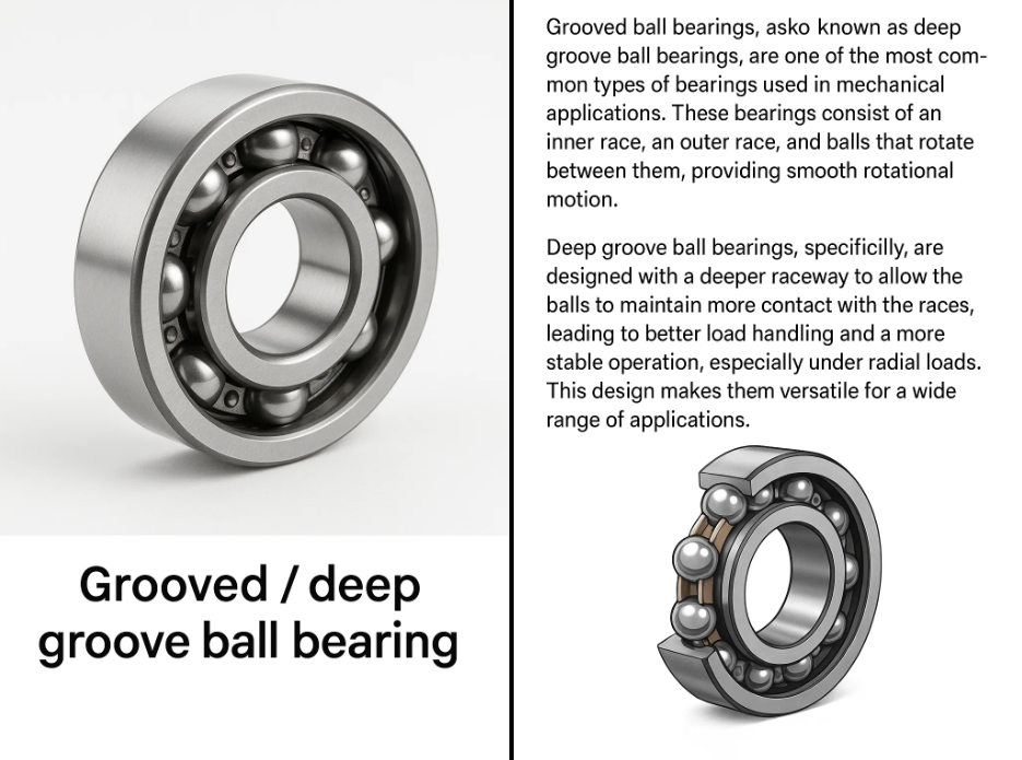 Grooved ball bearings, also known as deep groove ball bearings, are one of the most common types of bearings used in mechanical applications. These bearings consist of an inner race, an outer race, and balls that rotate between them, providing smooth rotational motion. The “groove” refers to the deeper raceway in the design that helps accommodate higher loads and offer smoother motion.