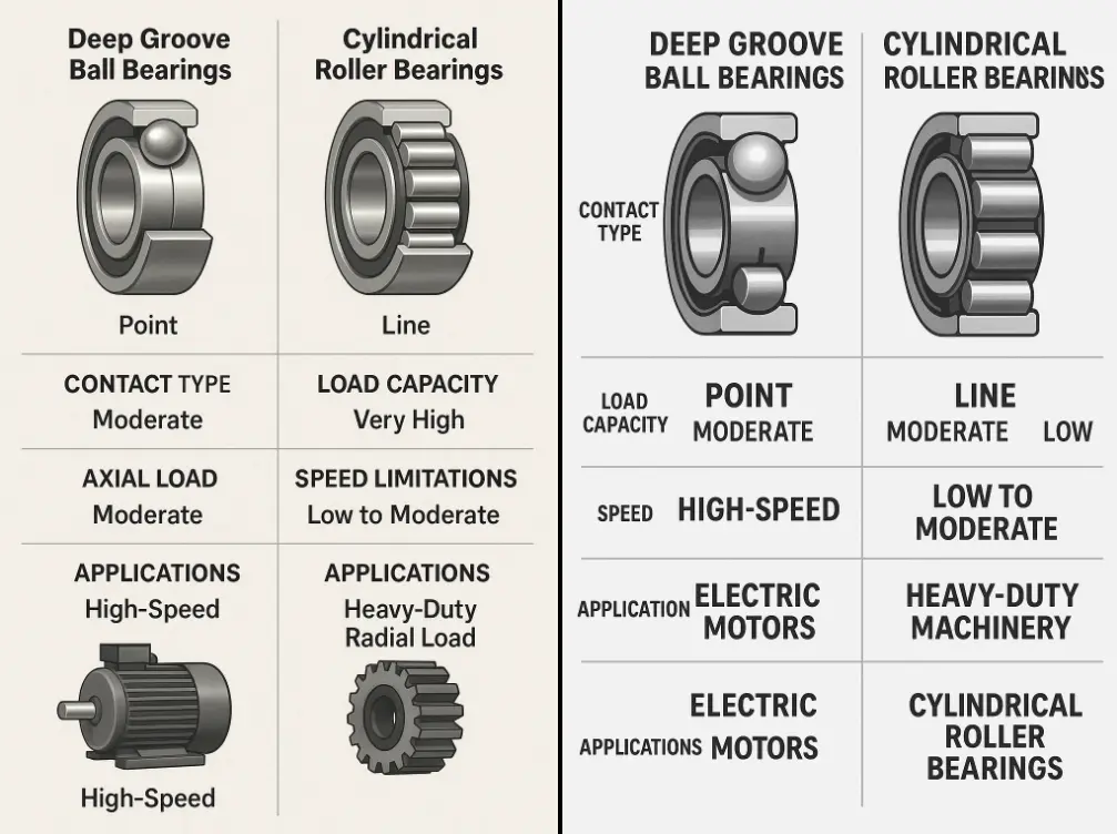 One of the primary differences between deep groove ball bearings and cylindrical roller bearings is the contact type between the rolling elements and the raceways.